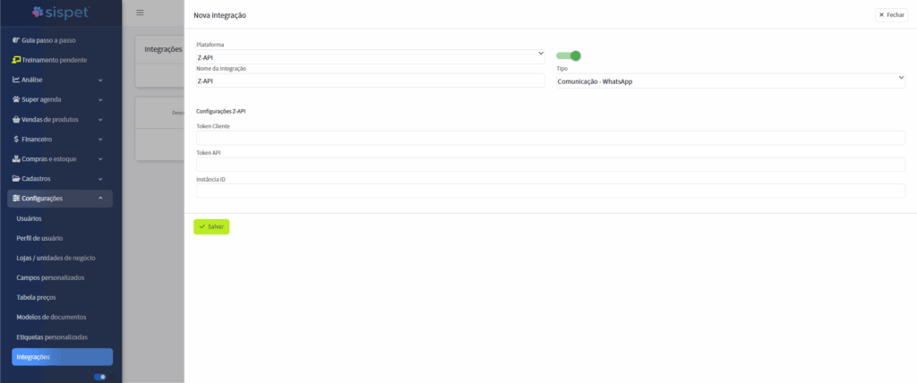 Clique em NOVO e preencha as informações. Os tokens e ID devem ser gerados dentro da plataforma escolhida.